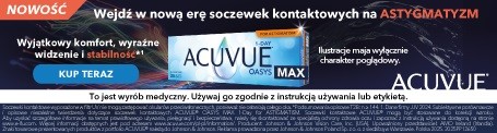 ACUVUE OASYS 1-Day for ASTIGMATISM to nowy produkt firmy Johnson & Johnson. Są to soczewki toryczne, czyli służące do korekcji astygmatyzmu. Wykorzystano w nich system stabilizacji powiekami EYELID STABILIZED DESIGN, dzięki czemu soczewki ustawiają się prawidłowo przy każdym mrugnięciu. Przekłada się to na wyraźny i stabilny obraz przez cały dzień. Jednodniowy tryb wymiany jest bardzo wygodny, ponieważ nie wymaga czyszczenia - po całym dniu szkła wyrzucamy do kosza, a rano zakładamy nową parę.